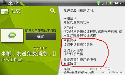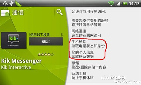 國內外Kik類應用也逐漸興起,騰迅最近也加入此陣營并推出其下產品微信。Kik類應用主要以用戶手機中聯(lián)系人目錄為主要的關系抓取,只要其聯(lián)系人中裝入該客戶端,用戶無需特意添加即可開始類似短信的聊天。以KikMessenger為例,其中便涉及讀取用戶聯(lián)系人信息、電話狀態(tài)和身份等權限。