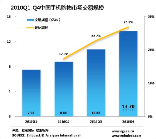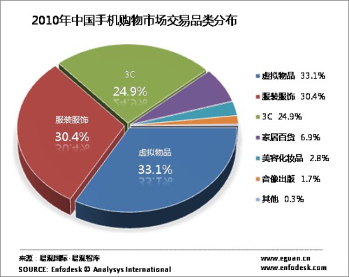 根據(jù)易觀智庫Enfodesk發(fā)布的《2010年第4季度中國手機(jī)購物市場季度監(jiān)測》數(shù)據(jù)顯示,2010年中國手機(jī)購物市場交易規(guī)模達(dá)到41億元。其中虛擬類商品交易規(guī)模達(dá)12億,占總體交易規(guī)模比例為33.1%。