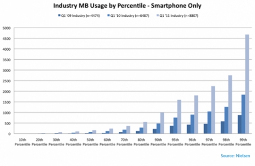研究公司Nielsen經(jīng)過統(tǒng)計(jì),發(fā)現(xiàn)從去年第一季度到今年第一季度,移動(dòng)數(shù)據(jù)的使用量增長了89%。一年前人平均使用量只有230M,而目前飆升至435M。這促使運(yùn)營商重新考慮其最優(yōu)數(shù)據(jù)提供量,以前是250M,現(xiàn)在已經(jīng)遠(yuǎn)遠(yuǎn)不能滿足需求。