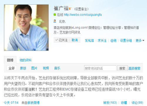 7月12日上午消息,因遭遇存儲故障,從昨日下午2時起,提供在線服務(wù)的旅游網(wǎng)站藝龍開始無法訪問,截至目前已經(jīng)過去了20個小時。藝龍CEO崔廣福通過新浪微博表示,藝龍工程師和EMC存儲工程師正在緊張搶修中,預(yù)計(jì)今天上午能夠恢復(fù)正常。新浪科技