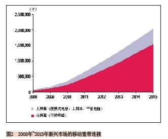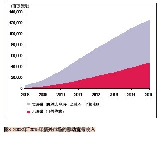 另外一個(gè)預(yù)測(cè)也可說(shuō)明這一趨勢(shì):2010年到2015年小屏幕移動(dòng)寬帶連接的復(fù)合年均增長(zhǎng)率為45%,而大屏幕的復(fù)合年均增長(zhǎng)率為36%,到2015年新興市場(chǎng)上將有16億的小屏幕連接和近4.59億的大屏幕連接。