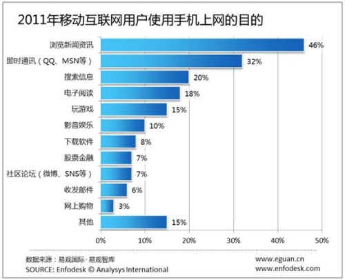 CTI論壇(ctiforum)9月1日消息(記者 潘婷婷):根據(jù)易觀國際對于中國移動互聯(lián)網(wǎng)用戶最新調(diào)研數(shù)據(jù)顯示,2011年移動互聯(lián)網(wǎng)用戶使用手機上網(wǎng)的目的中,瀏覽新聞資訊、即時通訊是集中度最高的兩個選擇,均占比30%以上,搜索信息、閱讀和玩游戲是用戶選擇的第二梯隊,第三梯隊則是影音娛樂、下載軟件,股票金融和社交。