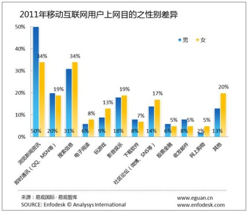 從用戶性別角度來看,男性用戶在瀏覽新聞資訊、股票金融、收發(fā)郵件上的使用上明顯高于女性用戶,與此同時及時通訊、社區(qū)論壇、影音娛樂和玩游戲上女性用戶的青睞度更高。