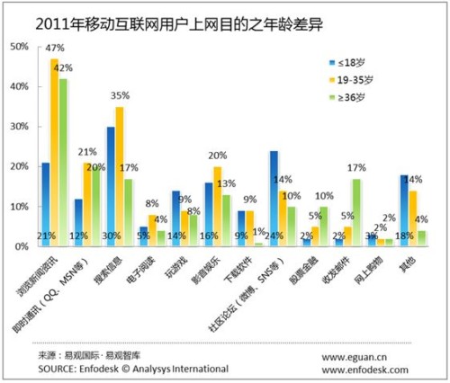 從年齡角度來看,19-35歲的用戶瀏覽新聞、資訊和即時通訊是手機上網(wǎng)的主要目的,35歲以上用戶使用移動互聯(lián)網(wǎng)的首要目的是瀏覽新聞資訊,即時通訊需求相較低于35歲用戶銳減。19歲以下用戶最主要使用移動互聯(lián)網(wǎng)目的在于即時通訊,其次在于玩游戲。