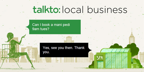 這一切是怎樣實現(xiàn)的呢?TalkTo通過短信與商家溝通。用戶可以通過web應用在TalkTo目錄中搜索需要的服務,輸入商家的詳細地址或者大概位置,TalkTo就可以確保商家看到用戶的短信。TalkTo用戶可以向商家提出問題和意見,或直接預定服務。“這一切就像和朋友發(fā)短信一樣簡單!