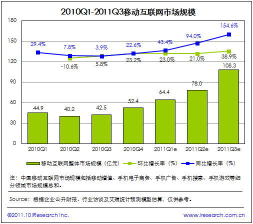 2011Q3中國移動互聯(lián)網(wǎng)市場規(guī)模達108.3億元