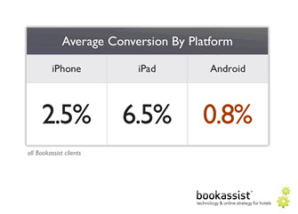 當(dāng)你看到以下數(shù)據(jù)時(shí),會(huì)覺(jué)得很有趣,Android用戶(hù)帶來(lái)的轉(zhuǎn)化率遠(yuǎn)低于平均水平,僅為0.8%;iPhone用戶(hù)帶來(lái)的轉(zhuǎn)化率是Android的3倍,為2.5%;而iPad用戶(hù)帶來(lái)的轉(zhuǎn)化率是Android的8倍,為6.5%。iPad帶來(lái)的轉(zhuǎn)化率出奇的高,體現(xiàn)了消費(fèi)者使用iPad的熱情。所以酒店經(jīng)營(yíng)者應(yīng)該優(yōu)先考慮此平臺(tái),確保他們的網(wǎng)站都針對(duì)iPad進(jìn)行了優(yōu)化。