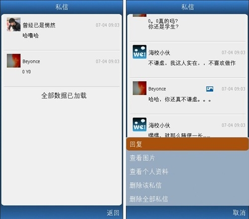 武俠小說中每每寫到傳音時,都愛這樣寫“不世高人傳音入密……”。這不世高人的稱號可是讓人夢寐以求啊。語音微博1.6 for Symbian最新加入的私信功能助你一償夙愿。每每查看其他用戶以及他的語音微博時,你都可以看到私信按鈕,點(diǎn)擊即可發(fā)送私信。傳音入密就是這樣簡單。當(dāng)然,除了語音,你也可以傳送文字,很貼心有木有。