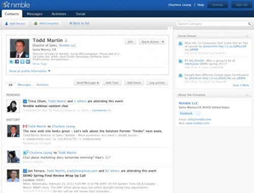 在一切皆可社會(huì)化的今天,客戶關(guān)系管理(CRM)服務(wù)的社交色彩也開始變得越來(lái)越濃。該領(lǐng)域內(nèi)的創(chuàng)業(yè)公司Nimble最近升級(jí)了它們的服務(wù),升級(jí)后的Nimble 2.0版更加強(qiáng)調(diào)社交信息的聚合管理,試圖給側(cè)重“信息輸入”的CRM服務(wù)領(lǐng)域帶來(lái)新變化。