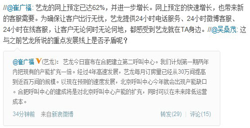 崔廣福在微博上說:“藝龍的網(wǎng)上預(yù)定已達(dá)62%,并進(jìn)一步增長。網(wǎng)上預(yù)定的快速增長,也帶來新的客服需要。為確保讓客戶出行無憂,藝龍?zhí)峁?4小時電話服務(wù)、24小時微博客服、24小時在線客服,讓客戶無論何時無論何地,都感受到藝龍就在TA身邊!