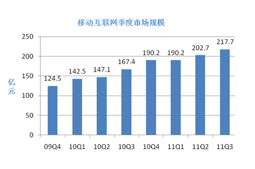 上圖是易觀國(guó)際發(fā)布的移動(dòng)互聯(lián)網(wǎng)的相關(guān)數(shù)據(jù),數(shù)據(jù)截止到2011年第三季度,該圖顯示,2009年全球經(jīng)濟(jì)復(fù)蘇之后,移動(dòng)互聯(lián)網(wǎng)業(yè)務(wù)收入一直保持著良好的增長(zhǎng)狀態(tài),最新數(shù)據(jù)表明,2011年移動(dòng)互聯(lián)網(wǎng)的整體市場(chǎng)規(guī)模已達(dá)到851億,遠(yuǎn)超過2010年的637億,增長(zhǎng)率將近33.6%,在移動(dòng)互聯(lián)網(wǎng)業(yè)務(wù)子領(lǐng)域中,表現(xiàn)最突出的是移動(dòng)電子商務(wù),與2009年相比較,移動(dòng)電子商務(wù)所占比例由3%直線增長(zhǎng)到11%。但是在手機(jī)閱讀和手機(jī)游戲方面則表現(xiàn)平平,有較大的增長(zhǎng)空間。預(yù)計(jì)2012年3G用戶規(guī)模將增長(zhǎng)到6億,將會(huì)超過互聯(lián)網(wǎng)用戶數(shù)量,智能機(jī)以及移動(dòng)互聯(lián)網(wǎng)還會(huì)保持或者超過2011年的增長(zhǎng)速率。