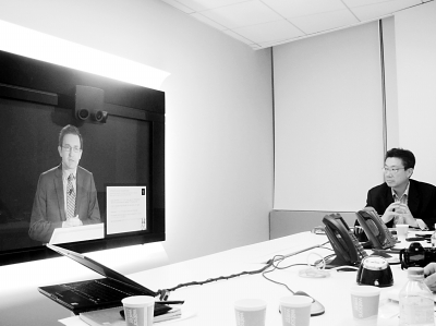 圖:Orange網(wǎng)絡解決方案業(yè)務部副總裁Nicolas Roy在巴黎演講,Orange中國區(qū)首席技術官劉昕(右)在主持北京視頻會議現(xiàn)場