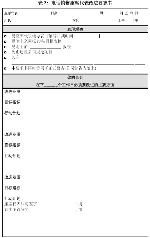 。。這里所列的兩張輔導表應(yīng)該是主管、質(zhì)檢與輔導師最常見的工具。那種無法對通話內(nèi)容進行具體、詳盡分析,或者輔導人自己也定義不清, 不能給出示范與明確改進方向的管理絕對不是專業(yè)的管理。在這類輔導表之外,可以根據(jù)通話的評價和其它一些紀律觀察,設(shè)計一種“改進要求表”,將根據(jù)表現(xiàn)觀察后制定的改進要求詳細列出。如果公司有書面警告一類的程序要求,也可揉合進改進要求書。