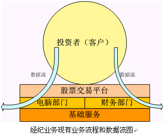 。。從上圖可以看出,現(xiàn)在的證券公司的經(jīng)紀(jì)業(yè)務(wù)為各個股民或者說投資者所提供的服務(wù)就是交易平臺的服務(wù),也就是交易通道服務(wù)。營業(yè)部的其他服務(wù)都是為這個交易通道服務(wù),這些服務(wù)品種都是非;A(chǔ)的。而營業(yè)部的數(shù)據(jù)流,也就是各個客戶的基本信息和交易信息,通過電腦部和財(cái)務(wù)部門就走到了終結(jié),沒有被更好的利用。