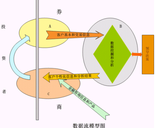 。。在整個的數(shù)據(jù)流循環(huán)模型中,可以分為三個模塊:A模塊,客戶通過交易通道進行投資活動;B模塊,根據(jù)客戶的基本信息和交易信息,進行大量的數(shù)據(jù)挖掘和數(shù)據(jù)分析,為領(lǐng)導(dǎo)決策進行支持,并且得到客戶的個性化信息和各種分析結(jié)果;C模塊,根據(jù)各種數(shù)據(jù)的分析結(jié)果,同時根據(jù)投資咨詢師手中現(xiàn)有的信息產(chǎn)品,為客戶提供真正的個性化的咨詢服務(wù),并且把此個性化的咨詢服務(wù)即時傳遞給投資者,為客戶進行下一次的投資活動而準(zhǔn)備。
