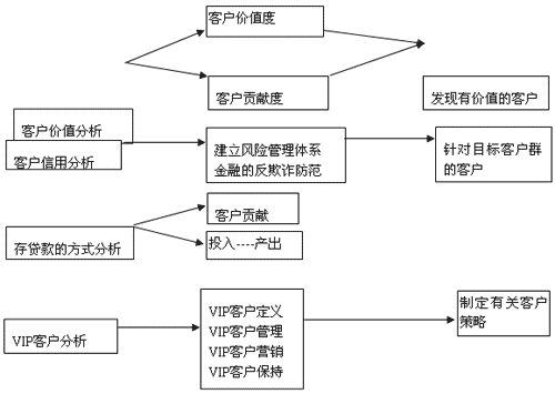 下面是一個(gè)以銀行業(yè)為例CRM中BI分析的一個(gè)簡單的應(yīng)用方式。