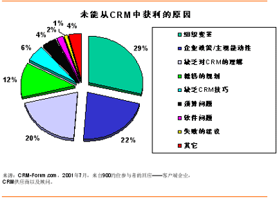 但成功只會(huì)擁抱那些能夠“正確執(zhí)行”的人,而不是任何一個(gè)搭上CRM順風(fēng)船的企業(yè)。2001年7月,CRM-Forum.com出版了一份關(guān)于未能從CRM中獲利原因的報(bào)告。從搜集到的來自CRM開拓者的約900個(gè)回應(yīng)來看——客戶端企業(yè),CRM供應(yīng)商以及顧問,組織變革及企業(yè)政策/主觀能動(dòng)性占了50%以上的失敗原因;緊隨其后的各個(gè)因素包括缺乏對CRM的理解(20%)和糟糕的規(guī)劃(12%)。下面讓我們就CRM方法論的選擇對這些因素作一番考察吧。