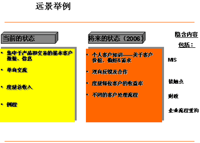 在評估當(dāng)前情況與遠(yuǎn)景,資源需求,癥結(jié),極限以及鋪就路標(biāo)和里程碑的關(guān)系時(shí),實(shí)施展望和差距分析會(huì)議是十分重要的。取決于你對CRM遠(yuǎn)景的定義——無論是它將成為一個(gè)能夠給你一把競爭利刃的企業(yè)策略 (類似的例子有Citicorp,Dell,F(xiàn)ord Motors) 或僅僅只是一個(gè)讓你更出眾的營銷項(xiàng)目——這邁出的第一步在你選擇CRM方法論的過程中都必將起到舉足輕重的作用。一個(gè)核心的方法論必須能夠支持企業(yè)大部分的業(yè)務(wù)和流程需求,如MIS;客戶體驗(yàn)管理;接觸點(diǎn)管理;收益率管理等等。
