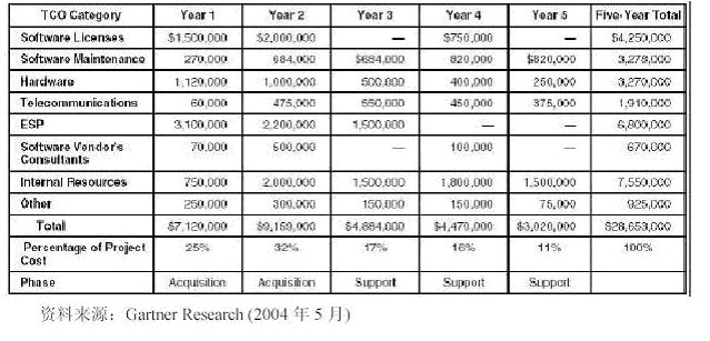 其它:這個類別涉及到上述種類中不含的TCO 成本,以便涵蓋項目評估流程期間的錯誤與疏忽部分,并作為項目執(zhí)行期間的假設(shè)與業(yè)務(wù)狀況的變化。許多公司都納入的成本實例有項目意外事故、房地產(chǎn)、附加的與正在進行的培訓(xùn)、以及T&E 等。