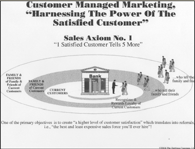 客戶滿意的影響范圍如下圖所示,客戶滿意的力量從里向外逐層波及,以現(xiàn)有客戶的滿意為基礎(chǔ),然后通過推薦傳遞到新的客戶。其傳遞路徑為“現(xiàn)有客戶”——“現(xiàn)有客戶的家人及朋友”——“現(xiàn)有客戶的家人及朋友的家人及朋友”…一直延伸下去最終使企業(yè)的營銷策略大獲成功,這一切的動(dòng)力都來自于“更高的客戶滿意度引起的客戶行為”。這個(gè)營銷公式要取得長期成功沒有任何秘密,它失敗的風(fēng)險(xiǎn)被最小化,因?yàn)樗揽康氖强蛻舴e極的行動(dòng)和表現(xiàn),以久經(jīng)考驗(yàn)的銷售公理——“1個(gè)滿意的客戶會(huì)把自己的愉快經(jīng)歷告訴5個(gè)以上的人!薄獮榛A(chǔ)。
