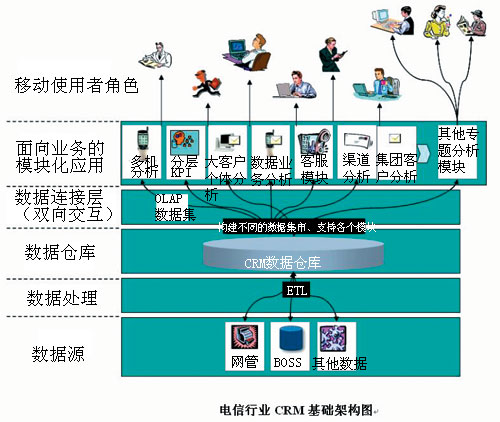 電信行業(yè)早期的CRM系統(tǒng)主要是由單一的多維分析子系統(tǒng)組成,比如移動(dòng)總公司最早的CRM系統(tǒng)就僅僅規(guī)范了以多維分析為標(biāo)準(zhǔn)的九大主題分析。隨著移動(dòng)電信市場的迅速增長,復(fù)雜程度越來越高,更多的子系統(tǒng)被添加進(jìn)來,IT系統(tǒng)建設(shè)中模塊化的思路通過數(shù)據(jù)集市的方式在CRM建設(shè)中體現(xiàn)明顯。