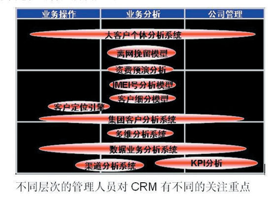 CRM系統(tǒng)有別于電信行業(yè)其他IT系統(tǒng)的最大特點(diǎn)是建設(shè)重心后移。BOSS、網(wǎng)絡(luò)管理平臺(tái)等作為運(yùn)營商的主要生產(chǎn)系統(tǒng),其建設(shè)重點(diǎn)在其基礎(chǔ)建設(shè)時(shí)期。這些系統(tǒng)的基礎(chǔ)建設(shè)完成上線使用后,作為生產(chǎn)系統(tǒng),其工作重點(diǎn)轉(zhuǎn)變?yōu)橄到y(tǒng)優(yōu)化調(diào)整以及新功能模塊的開發(fā)工作,整個(gè)系統(tǒng)的使用可以全面鋪開。但是CRM系統(tǒng)的建設(shè)過程往往會(huì)從需求調(diào)研、功能架構(gòu)設(shè)計(jì)、基礎(chǔ)建設(shè)一直延伸到了應(yīng)用實(shí)施。只有系統(tǒng)應(yīng)用好了,出效益了,才能推動(dòng)整個(gè)CRM系統(tǒng)的向前演進(jìn)。