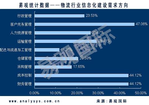 易觀國際《中國物流行業(yè)信息化年度綜合報告2006》數(shù)據(jù)統(tǒng)計,物流企業(yè)選擇管理信息化建設(shè)方向最迫切的需求是客戶關(guān)系管理,占到全部企業(yè)的47%以上。