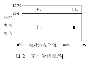 (二)確定客戶當(dāng)前相對(duì)價(jià)值和客戶相對(duì)潛在價(jià)值通過預(yù)測(cè),識(shí)別出了客戶當(dāng)前價(jià)值CCV和增值潛力CPV。但是,這兩個(gè)維度指標(biāo),均以絕對(duì)價(jià)值形式出現(xiàn)對(duì)客戶進(jìn)行細(xì)分并不理想(張國(guó)方,金國(guó)棟,2003(3)),在一定程度上會(huì)影響到理論應(yīng)用的方便性(簡(jiǎn)便性)。因此,可以采用更加明了和更具有實(shí)踐操作性的維度指標(biāo)——客戶當(dāng)前相對(duì)價(jià)值和客戶相對(duì)潛在價(jià)值!翱蛻舻南鄬(duì)當(dāng)前價(jià)值”是指某一客戶提供的當(dāng)前價(jià)值與企業(yè)未來(lái)可望實(shí)現(xiàn)的當(dāng)前價(jià)值總額的比值;而“客戶的相對(duì)潛在價(jià)值”是某一客戶提供的增值價(jià)值與企業(yè)未來(lái)可望實(shí)現(xiàn)的全部最大增值價(jià)值的比值。