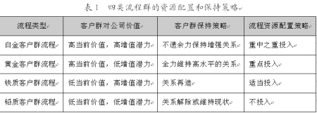 流程由活動(dòng)、活動(dòng)的邏輯順序、活動(dòng)的實(shí)現(xiàn)方式、活動(dòng)的承擔(dān)者四個(gè)基本要素組成。通過活動(dòng)的整合來(lái)產(chǎn)生“流程多面手”或活動(dòng)講廢除來(lái)減少成本,利用信息技術(shù)將“串聯(lián)”活動(dòng)變成“并聯(lián)”活動(dòng)來(lái)改變活動(dòng)斬邏輯順序以提高流程效率,或者改變活動(dòng)承擔(dān)者的數(shù)量或素質(zhì),這些都將導(dǎo)致流程群資源分配的變動(dòng)。例如,銀行的業(yè)務(wù)流程設(shè)置:低價(jià)值客戶以電子設(shè)備的自助服務(wù)為主;中價(jià)值客戶以柜面服務(wù)為主;高價(jià)值客戶以大戶室一對(duì)一服務(wù)為主;設(shè)置專業(yè)化的理財(cái)中心,由客戶經(jīng)理全程代為辦理各項(xiàng)業(yè)務(wù),同時(shí)由高素質(zhì)的理財(cái)專家根據(jù)客戶的風(fēng)險(xiǎn)收益偏好提供高質(zhì)量的理財(cái)產(chǎn)品等?梢姡煌蛻羝淞鞒痰馁Y源配置差異較大。依據(jù)客戶群——流程矩陣,下表描述了四類流程群所對(duì)應(yīng)的四類客戶群的四種資源配置方式。