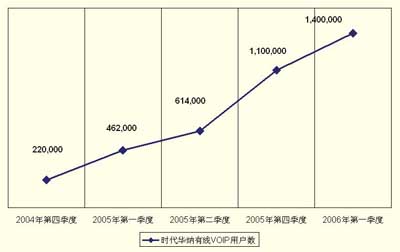 很快時(shí)代華納有線(xiàn)的VoIP業(yè)務(wù)就出現(xiàn)了強(qiáng)勁的增長(zhǎng),2005年的頭幾個(gè)月,其VoIP用戶(hù)數(shù)以幾乎每周1萬(wàn)的速度增加,到2005年第二季度,時(shí)代華納有線(xiàn)就成為全美第二大VoIP提供商。圖1描述了時(shí)代華納有線(xiàn)從2004年到2006年初的VoIP客戶(hù)強(qiáng)勁增長(zhǎng)。