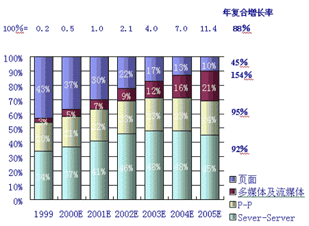 同時(shí),人們對P-P的互動(dòng)及多媒體的傳輸?shù)男枨髮⒊蔀榫W(wǎng)絡(luò)使用的2個(gè)最主要的發(fā)展趨勢。據(jù)麥肯錫公司和JP摩根的分析和預(yù)測,多媒體及流媒體的IP流量將以每年154%的復(fù)合率增長,而P-P的IP流量將以95%的年復(fù)合增長率增長,這2項(xiàng)將成為用戶需求增長最快的業(yè)務(wù)。如下圖,