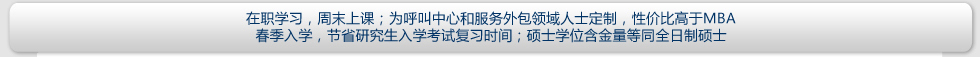 | 報(bào)名條件 | 擁護(hù)中國(guó)憲法,遵守法律、法規(guī),品行端正,身體健康,并能堅(jiān)持在職學(xué)習(xí); 大專及以上學(xué)歷,旨在提高本人專業(yè)素質(zhì)和學(xué)歷層次的 社會(huì)在職人士均可報(bào)名;擇優(yōu)錄取。 呼叫中心、服務(wù)外包領(lǐng)域的中高級(jí)從業(yè)者,英語(yǔ)基礎(chǔ)良好的人士將獲得優(yōu)先錄取機(jī)會(huì)。 |