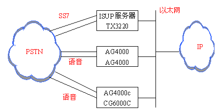 系統中ISUP服務器通過SS7鏈路和PSTN連接,通過IP網絡和語音處理機連接,這兩個連接傳送的是信令信號。語音處理機通過話路和PSTN連接,這個連接傳輸的是語音。