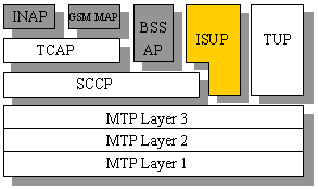 ISUP建立在MTP1、2、3層之上,直接和MTP3層進行通信,大部份的消息都是直接在MTP3和ISUP層間傳遞。只有支持ISDN終端之間的直接通信,ISUP才經過SCCP層再連接到MTP3。
