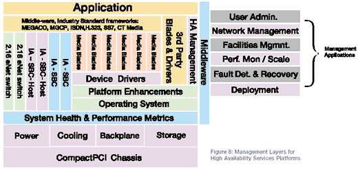 圖8展示了管理層的外觀,它兼容PICMG 2.16的CompactPCI平臺。在較低的水平上,系統(tǒng)的健康和性能度量標(biāo)準(zhǔn)通過平臺的可替換單元(FRUs)和中間設(shè)備之間互相通信的平臺性能提升得以實(shí)現(xiàn)。HA管理軟件層提供健康和性能方面的度量標(biāo)準(zhǔn)和最高層管理應(yīng)用之間的通信。