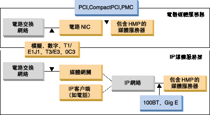 部署架構(gòu) 模塊化的下一代網(wǎng)絡(luò)將語(yǔ)音和數(shù)據(jù)合并在單個(gè)包基礎(chǔ)結(jié)構(gòu)中。這使目前的兩種主要架構(gòu)可用于部署媒體服務(wù);基于直通電路的網(wǎng)絡(luò)接口和基于包的IP網(wǎng)絡(luò)接口。下面的圖說(shuō)明了這兩種架構(gòu)。Dialogic