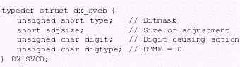 。。速度/音量調節(jié)表(DX_SVMT)數(shù)據(jù)結構有21個代表不同級別的速度和音量的條目,用于指定信道的速度或者音量調節(jié)的變化率。這些值可以設置或者用dx_setsvmt()和dx_getsvmt()從表中取值。