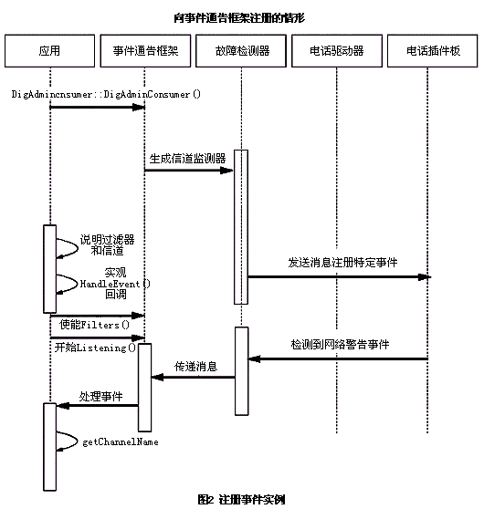 。。在這個事務中的主要部件是應用程序、板卡的設備驅(qū)動器和管理軟件(包括故障檢測器和事件服務,事件服務中同時包括事件通告框架)。當電話板卡發(fā)生DSP故障時,板卡上運行的固件通過發(fā)送一條消息通知控制程序?刂瞥绦蚴且粋在初始化時注冊了不同告警和故障的故障檢測器。當它收到這個故障通告后,控制器在事件服務的事件通告框架的隊列中增加一個事件。最后,使用回調(diào)函數(shù)通知應用程序。此時,應用程序可以處理這個事件,執(zhí)行必要的操作或者動作。